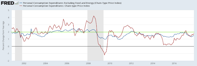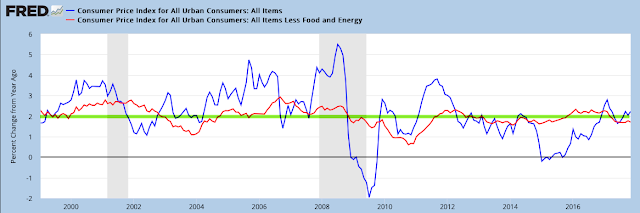 CPI (blue line) was 2.2% last month. The more important core CPI (excluding volatile food and energy; red line) grew 1.7%.