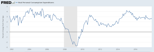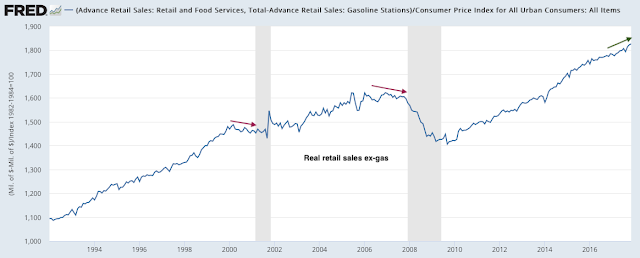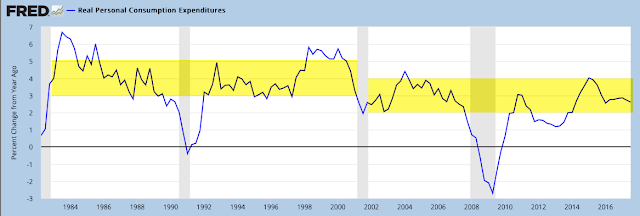 The "real personal consumption expenditures" component of GDP (defined), which accounts for about 70% of GDP, grew at 2.6% yoy in 3Q17. This is approaching the 3-5% that was common in prior expansionary periods after 1980.