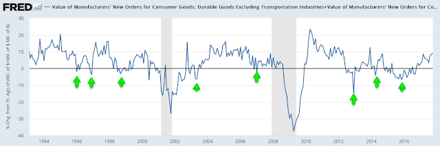 Core durable goods orders (excluding military, so that it measures consumption, and transportation, which is highly volatile) rose 10.2% yoy (nominal) in November, the best annual growth rate in 4 years (since December 2013). Weakness in durable goods has not been a useful predictor of broader economic weakness in the past (arrows).