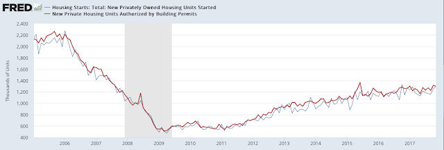 Building permits are flat over the past two years (red line). Permits rose 3% yoy in November after falling 1% yoy in November 2016.