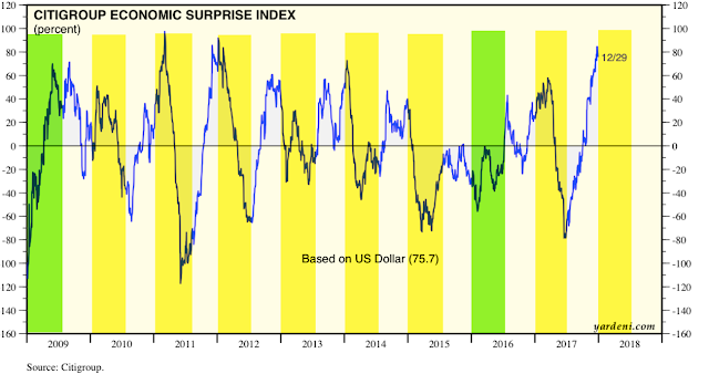 Macro data will likely underperform expectations in 1H18. Why? Macro data ended 2017 well ahead of expectations. During the current expansion, that has led to underperformance of macro data relative to expectations into the following mid-year (yellow shading). 2009 and 2016 had the opposite pattern: macro data underperformed expectations into the prior year-end and then outperformed in the first half of the year (green shading).