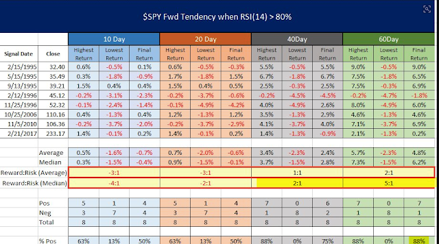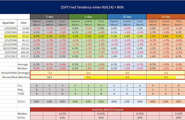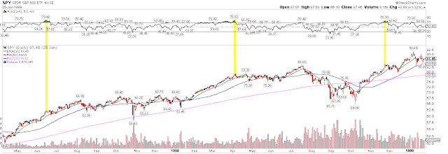 Instances where RSI(14) was near 80 are highlighted in the charts that follow. Only two instances from 1995-96 (circled) are near current extremes.