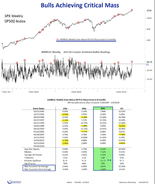 Likewise, the number of bulls polled by AAII reached a substantial high this week. The results are the same: low interim drawdowns and price has been higher 6 months later every time.
