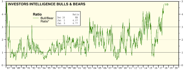The Investors Intelligence bull/bear ratio spiked to a 30 year high this week. The chart looks terrifying. Yet this is a sample of one and in that one example (from 1987), SPX rose 20% in the next 3 months and 35% in the next 7 months. Of course, it ended badly for those who entered late, but the year closed positive (from Yardeni).