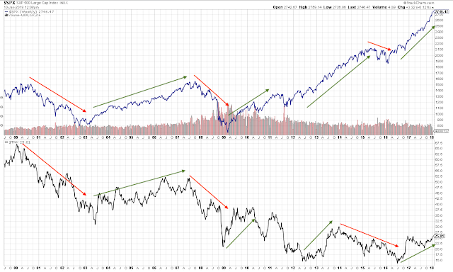 The second affect is that investors' sentiment is reaching extremes. While excessive bearish sentiment coincides with equity lows, the same is not true for excessive bullish sentiment at tops. Many times, price continues higher.