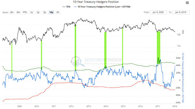 Notably, commercial hedgers, who tend to be the "smart money", have substantially increased their long exposure to treasuries to one of the highest levels in 10 years. This has been close to prior reversal points in yields during this period (the chart below shows treasury prices, which move opposite to yields; from Sentimentrader; to become a subscriber, please use this link).