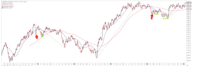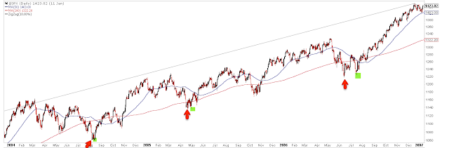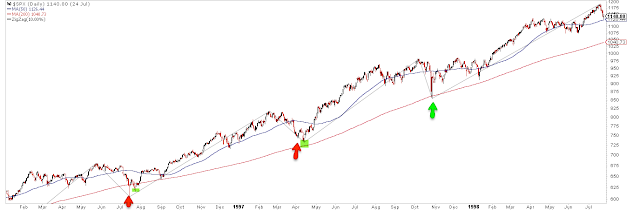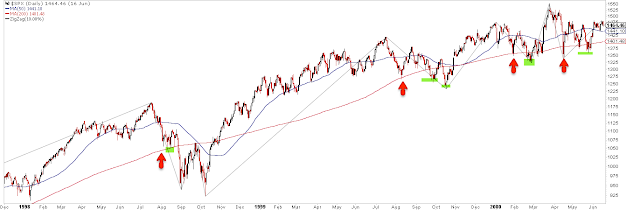 In the charts below, a red arrow is the initial 10% fall and the green highlight is the retest of the low in following weeks. 84% of the corrections have had a low retest (or a lower low).