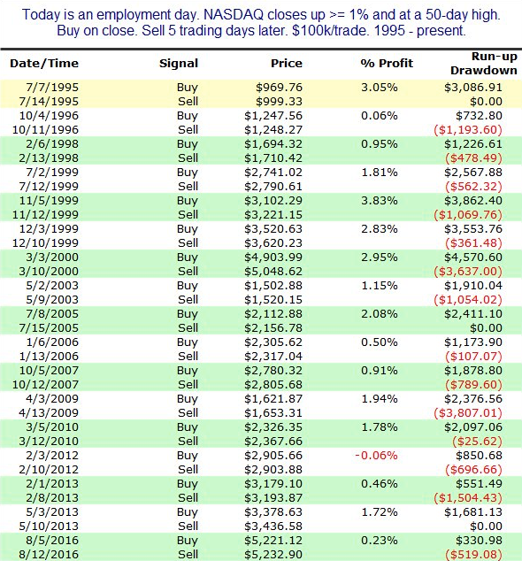 The week ended with the release of a very strong employment report on Friday. When the Nasdaq gains more than 1% to a 50-d high on the day of the NFP release, it has added to those gains in the next week in 16 of 17 instances (94%; from Quantifiable Edges).