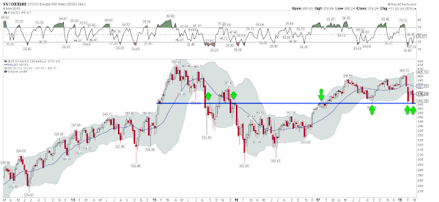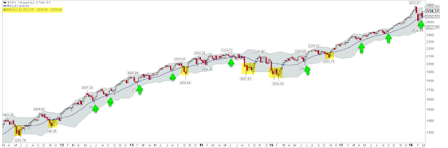 The drama in 2018 is probably not over. Years that have a greater than 5% decline in the first few months tend to also have rough "summer" months. And as mentioned last week, a trip to the lower weekly Bollinger Band, which hasn't happened in over 14 months, is a normal annual bull market occurrence (read here).