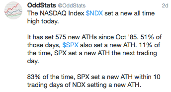 Technology leadership is a strong positive. The Nasdaq Composite and 100 indices both made new all-time highs (ATHs) on Friday. 83% of the time, SPX follows to a new ATH within the next 10 days (from @OddStats).
