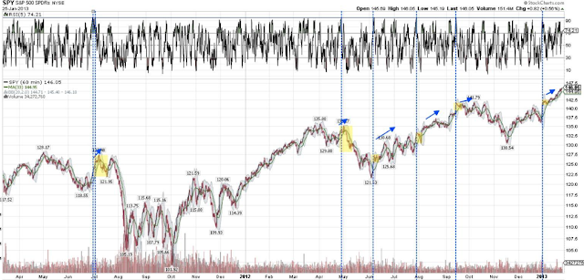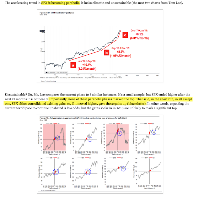 That equities continue to rise after their parabolic move might seem surprising. It shouldn't be. The rise into the January top was comparable to 8 other instances; in each of these, SPX went on to higher highs, usually after a multi-week period where recent gains were given up or consolidated, much like what the indices have done over the past month and a half. The chart below was from a post in January (read here) using an analysis from Tom Lee (read here).