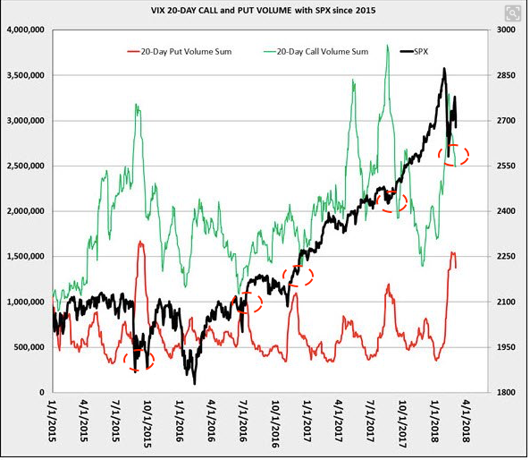 Into last week's low, "smart money" put buying in the VIX spiked to an extreme (red line). That has a good record of coinciding with a high in volatility and near term low in SPX (black line; from Schaeffer's).