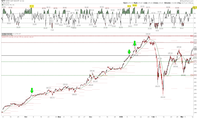 In summary, the Nasdaq closed at a new all-time high (ATH) on Friday. It has risen 6 days in a row. A number of studies suggest that it should continue to rise further, and that SPX should follow it, probably also to a new ATH. That is the near term set up as equities enter March options expiration week which is historically bullish (read here).