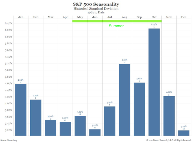 Traders should also take note that volatility tends to be muted in May, June and July, the season where many imagine that Wall Street has retired to the Hamptons. Then come the three most volatile months of the year - August through October - when the seasonal low and subsequent rebound tend to take place.