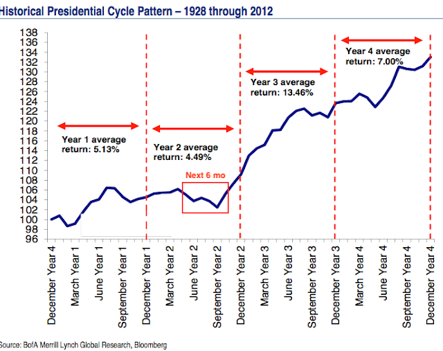 Starting with the presidential cycle, while it's generally true that stocks are weaker in mid-term years than in other years, stocks have still risen an average of 4.5% during this period (since 1928). That may be less than other years, but it is still a decent gain.