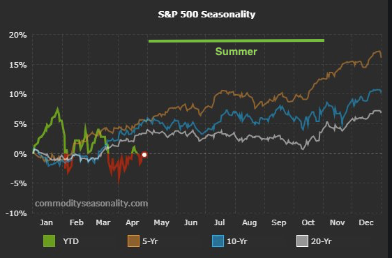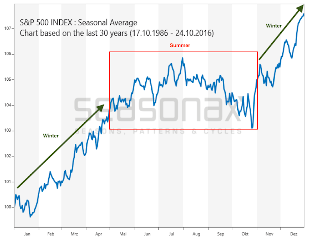 Second, the seasonally weak summer: 'Sell in May and buy after Halloween' is one the oldest axioms on Wall Street. Returns from May through October ("summer") are generally weak compared to those from November through April ("winter"; from Seasonax.com).