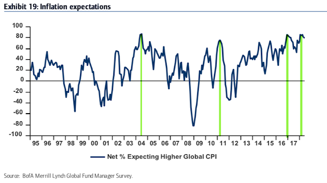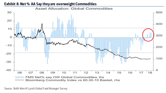Fund managers' inflation expectations are near a 14 year high; in the past, this has corresponded with a fall in US 10 year yields in the months ahead. Commodity allocations are at a 6 year high.