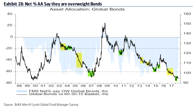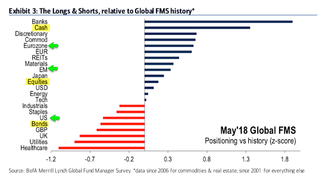 Summary: Fund managers came into 2018 very bullish equities. Cash levels had fallen to the lowest level in 4 years. Allocations to global equities had risen to the highest level in nearly 3 years. Bond allocations were at a 4 year low. Our view at the time was that "this is a headwind to further gains" in equities. That post is here.