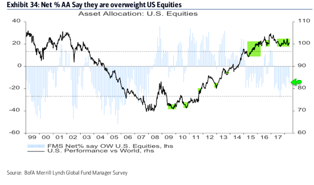 In September 2017, investors again became bearish US equities, giving them the lowest allocation in 10 years. US equities have since outperformed.
