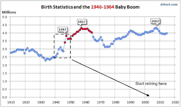 In the US, the largest birth cohort in the nation's history was close to entering retirement. Between 1940 and 1950, the number of births per year in the US increased by a massive 45%, and that group would begin retiring around 2005 (data from Doug Short).