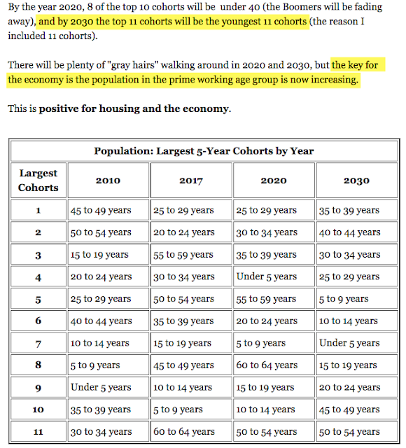 The upshot, to paraphrase Bill McBride, is this: "Demographics is a key driver of economic growth. Most people focus on the aging of the baby boomer generation. But the movement of these younger cohorts into the prime working age is a key economic story in coming years."