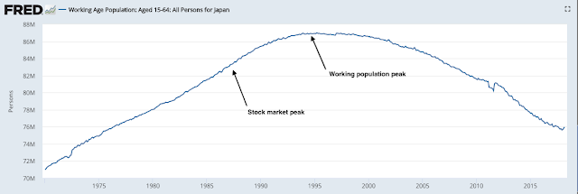 Starting around the year 2000, many investors began obsessing over the aging demographic profile in the United States. The concern seemed reasonable. The working age population in Japan had peaked in 1995, 5 years after the Nikkei stock index. The stock market had halved by 2000 as the working population declined (by 13% from 1995 to 2018). Enlarge any chart by clicking on it.