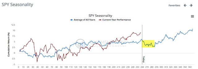 First, the week after September options expiration is the "weakest week" of the year. In the 27 years since 1990, SPX has traded down through Thursday a remarkable 82% of the time (from Quantifiable Edges; click for the full article).