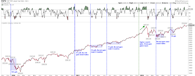 SPX reached the top of a 5-month rising channel in early September (blue line) and then successfully retested the breakout above its January high (top red line). So far, there's no foul. But a return to 2870 likely leads to a break lower, to the 50-d, the bottom of the rising channel or to 2800 (bottom red line). There is plenty of support and the worst of these outcomes represents a total decline of just 4%.