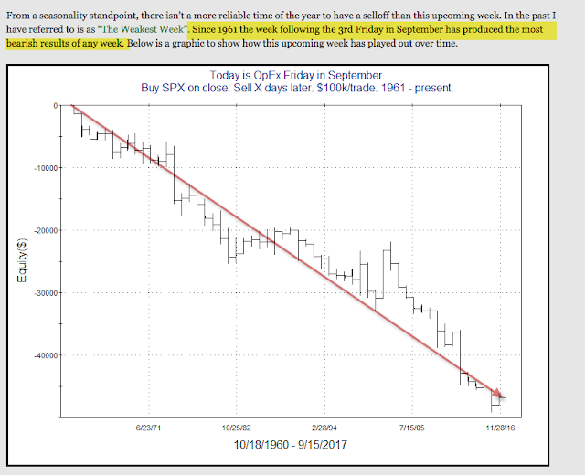 First, the week after September options expiration is the "weakest week" of the year. In the 27 years since 1990, SPX has traded down through Thursday a remarkable 82% of the time (from Quantifiable Edges; click for the full article).