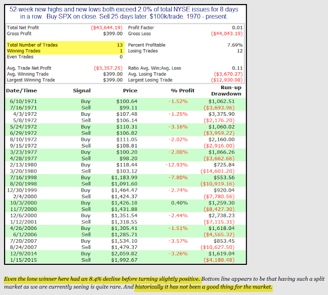 Third, market breadth has split: while some stocks are hitting new highs, many others are hitting new lows. When this happens every day for a week or more, the SPX has almost always traded lower over the next month: since 1970, all 13 instances have preceded losses (from Quantifiable Edges; click for the full article).