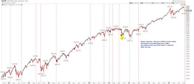 The current swoon is probably not over. SPX has fallen 3 weeks in a row, for the first time since June 2016. Since 2003, SPX has fallen 3 weeks in a row more than 20 times, and all eventually retested or exceeded the low, at least intra-week. This almost always occurs within the next 3 weeks but in 2004 and 2015 it took 6-7 weeks to occur (highlighted in yellow).