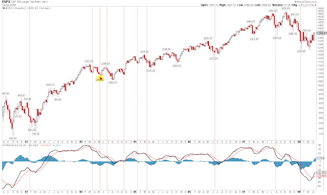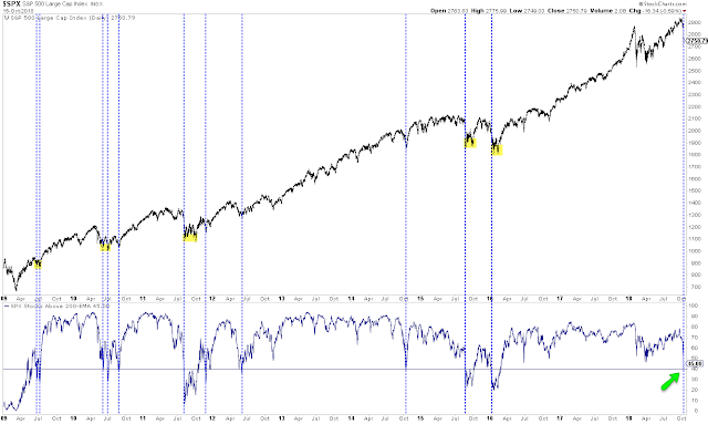 Last week, less than 40% of SPX stocks traded above their 200-ema (bottom panel). That hasn't always marked the exact low - in several instances, there was a double bottom, highlighted in yellow - but risk/reward was clearly biased to the upside each time. That was also true during the 2003-07 bull market.