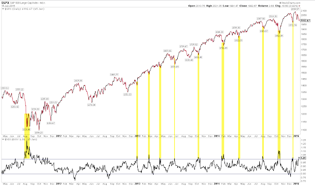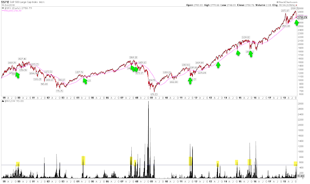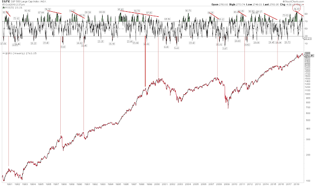 For one, the macro economic data shows the expansion remains robust. Many traders wrongly assume that equity price action leads macro fundamentals. In fact, employment, housing and consumption will weaken before the final equity top. That's one reason why the widely followed yield curve "inverts" ahead of the next recession and the ultimate cycle high in equities. Even the composite Leading Economic Indicator (LEI) has peaked a median of 3 months before SPX over the past 50 years; the most recent reading was at a new cycle high. Based on this, a significant equity peak before the end of 2018 is unlikely. A recent post on this is here.