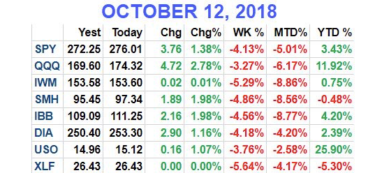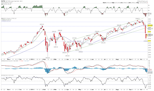 US equities fell 4-5% last week. The nearly 10% gain in 2018 at the end of September for SPX has been reduced to just 3%. Small caps have been hit the hardest and are now barely above their level at the start of the year (table from alphatrends.net). Enlarge any chart by clicking on it.