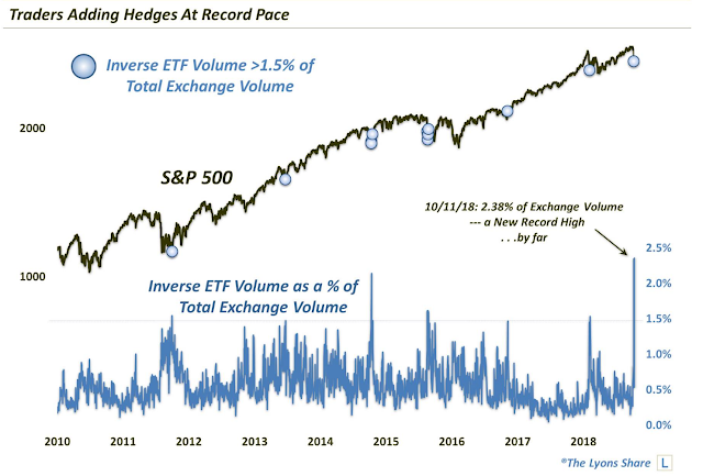 Investors flooded into inverse ETFs (that bet on a further fall in equities), with relative volume hitting a record high. This has preceded strong equity rallies. Even in 2015 and earlier this year, SPX rose 12% and 7%, respectively, before rolling over (from Dana Lyons).