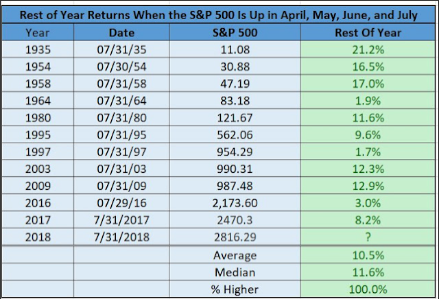 Likewise, SPX closed higher in April, May, June, and July. In the 11 times this has happened since 1935, the index closed higher 5 months later (i.e., at year -end) every time by median of 12%. For reference, the July close was 2816, 2.2% higher from Monday's close (from Ryan Detrick).