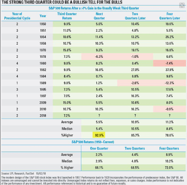 And SPX gained 7% in 3Q. Since 1950, a strong 3Q has been followed by a strong 4Q every time except once (93%), with a median gain of 5%. The one failure closed higher by nearly 7% a year later (also from Ryan Detrick).