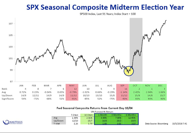 Over the final 3 months of the year during mid-elections, SPX has risen 20 of the last 22 times (91%; from Nautilus Research).