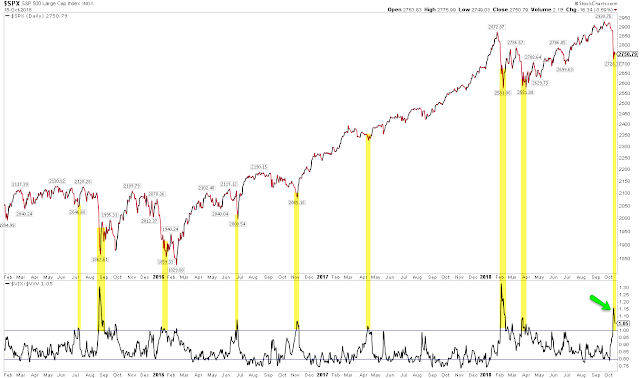 Part of the calculation in this index is volatility. By last Wednesday's close, VIX had more than doubled from the end of September. 1 month volatility is still trading at a premium to 3 month volatility, a condition that has only occurred near equity lows in the past 8 years, the last one being in early April before a 6 month rally.