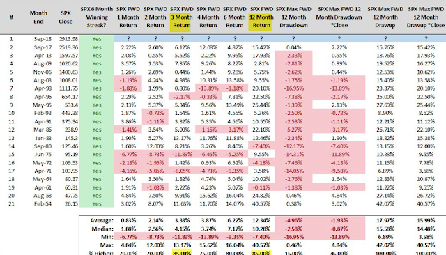 Before October, SPX had risen 6 months in a row. Going back 60 years, that has never marked a bull market top: SPX closed higher 3 months later (in this case, at year-end) 85% of the time by a median of 4%. The three failed instances closed higher within 6-12 months (from Steve Deppe).