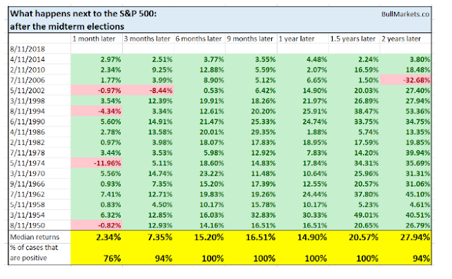 The period after the mid-term election is also a strong tailwind for equities. SPX has been higher 6, 9 and 12 months later every time since 1950 (from Troy Bombardia).