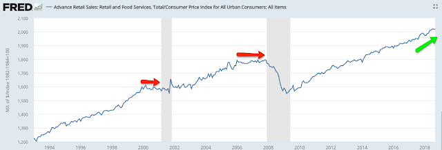 Monday's retail sales report for September showed real growth of 2.4% yoy. Retail sales are at their second highest level ever; in comparison, the trend had clearly flattened well in advance of the two most recent recessions. That's the normal pattern.