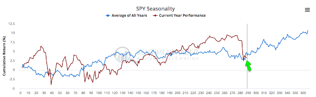Finally, all of this is occurring a month before the mid-term elections. Stocks have a strong tendency to bottom in mid-October and rally through year end (from Sentimentrader).
