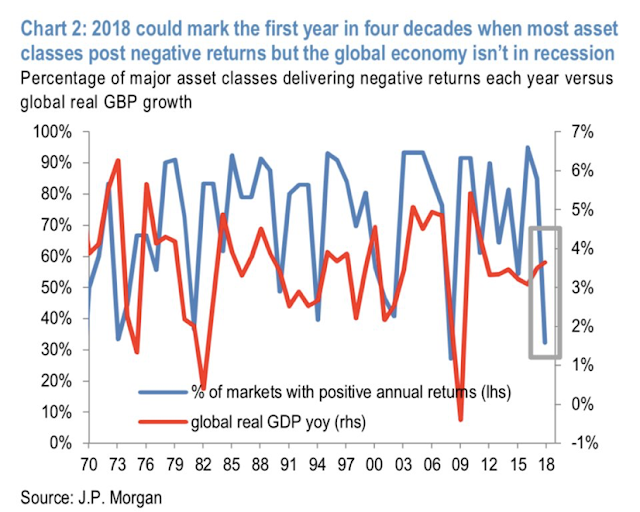 "2018 could mark the fist year in four decades when most asset classes post negative returns (blue line) but the global economy (red line) isn't in a recession (from JP Morgan)."
