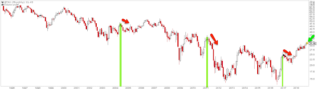 - Bonds: Global bonds started to underperform in mid-2010, 2011 and 2012 when they reached -20% underweight. -60% underweight is often a bearish extreme.