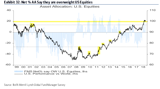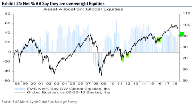 Summary: Although US equities are up about 2% in 2018, Europe is down 10% and emerging markets are down more than 15%. Part of the reason: fund managers came into 2018 very bullish, with cash levels at 4-year lows and allocations to global equities at 3-year highs.