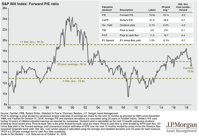 With the relatively minor appreciation in equity prices so far in 2018, valuations are slightly below their 25-year average (from JPM).