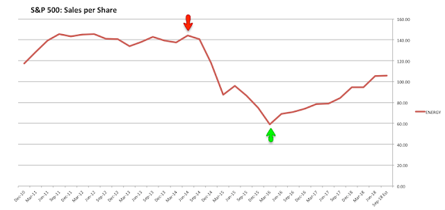 The arrows in the chart above indicate the period from 2Q14 to 1Q16 when oil prices fell 70%. The negative affect on overall S&P sales (above) and the energy sector alone (below) is easy to spot.