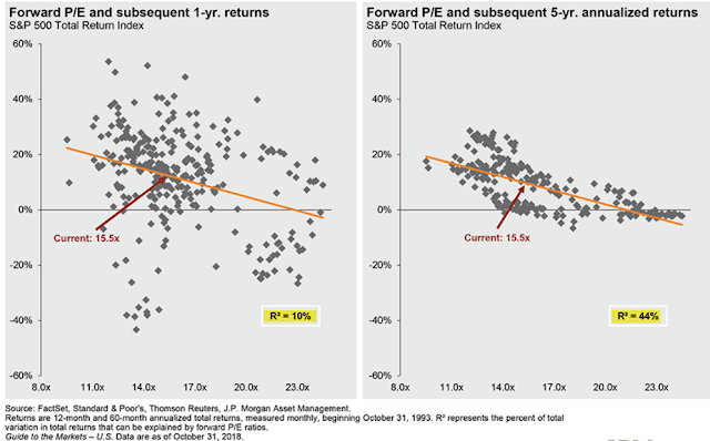 Importantly, valuations have almost no bearing on the market's 1-year forward return (left side). But over the longer term, current valuations suggest that single digit annual returns are odds-on (right side; from JP Morgan).