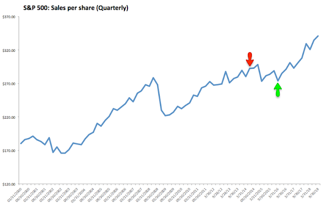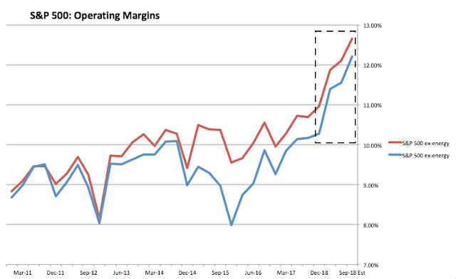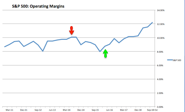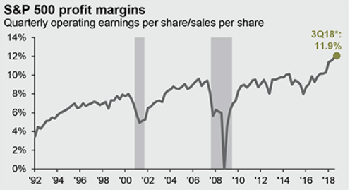 Likewise, overall S&P profit margins peaked at 10.1% in early 2014, fell to 8% at the end of 2015 and have since rebounded to new highs of 12.2% in 3Q18.